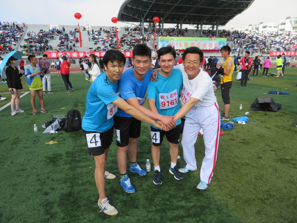 由王斌、马存飞、远二辉、玉素甫江.艾买提四位老师完成的男丙4*400米,拿下冠军,创造了奇迹,确保了团体总分第一!这是一次伟大的接力赛:远二辉超了3、4个对手,玉素甫江.艾买提曾在弯道被理学院超越,冲刺阶段又反超回来,真是好样的!