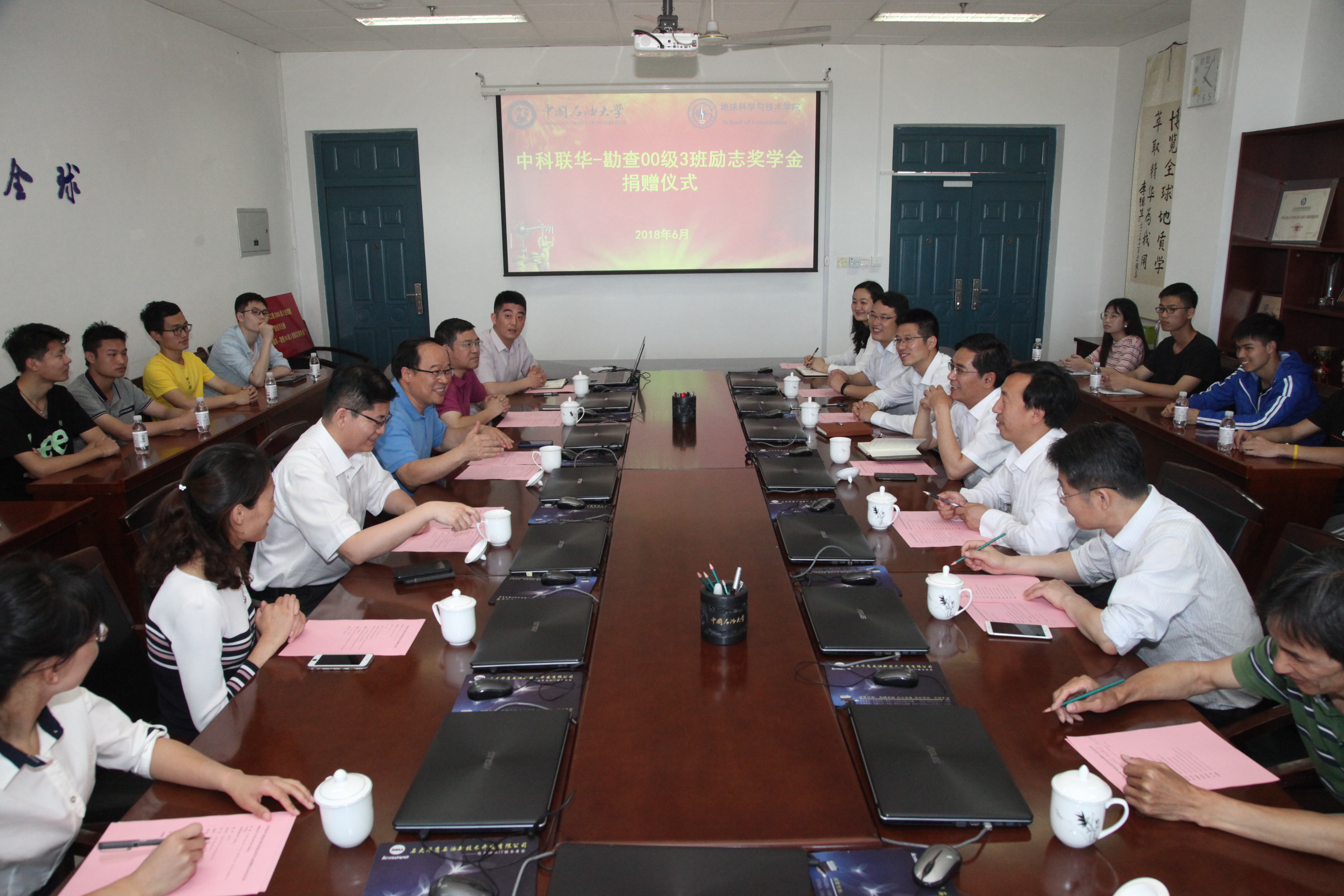 【本站讯】6月17日下午,我校勘查技术与工程2000级3班校友彭斐、尹成芳回到母校,代表勘查2000级3班全体校友向母校捐赠10万元,设立“中科联华-勘查00级3班励志奖学金”。副校长姚军出席仪式,代表学校接受捐赠并回赠捐赠证书和纪念牌。学校合作发展处、地学院相关领导及师生代表参加捐赠仪式并与校友座谈交流。