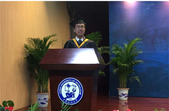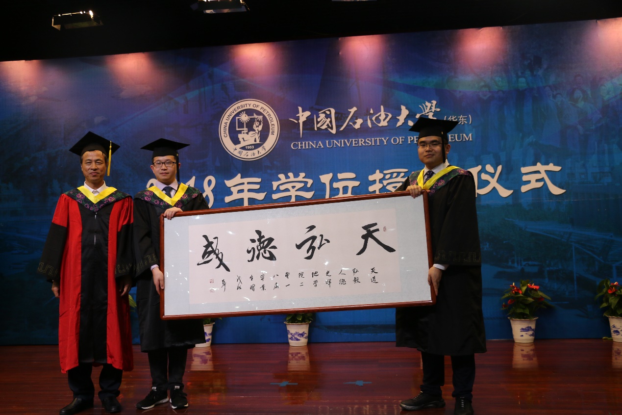 毕业生代表刘衍琦、赵佳辰和裴进峰向林承焰院长赠送纪念礼物。资源勘查工程专业2014级本科生徐明权作为2018届毕业生代表发言。他结合四年求学的经历以及大学生活的点滴,分享了自己的成长经验,并代表全体2018届毕业生给予学校和学院最美好的祝愿。