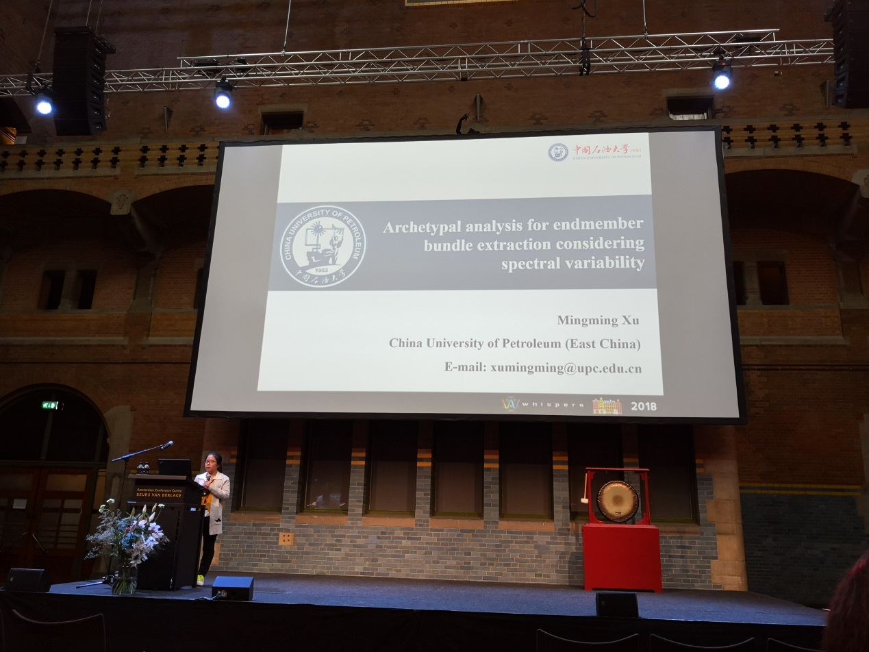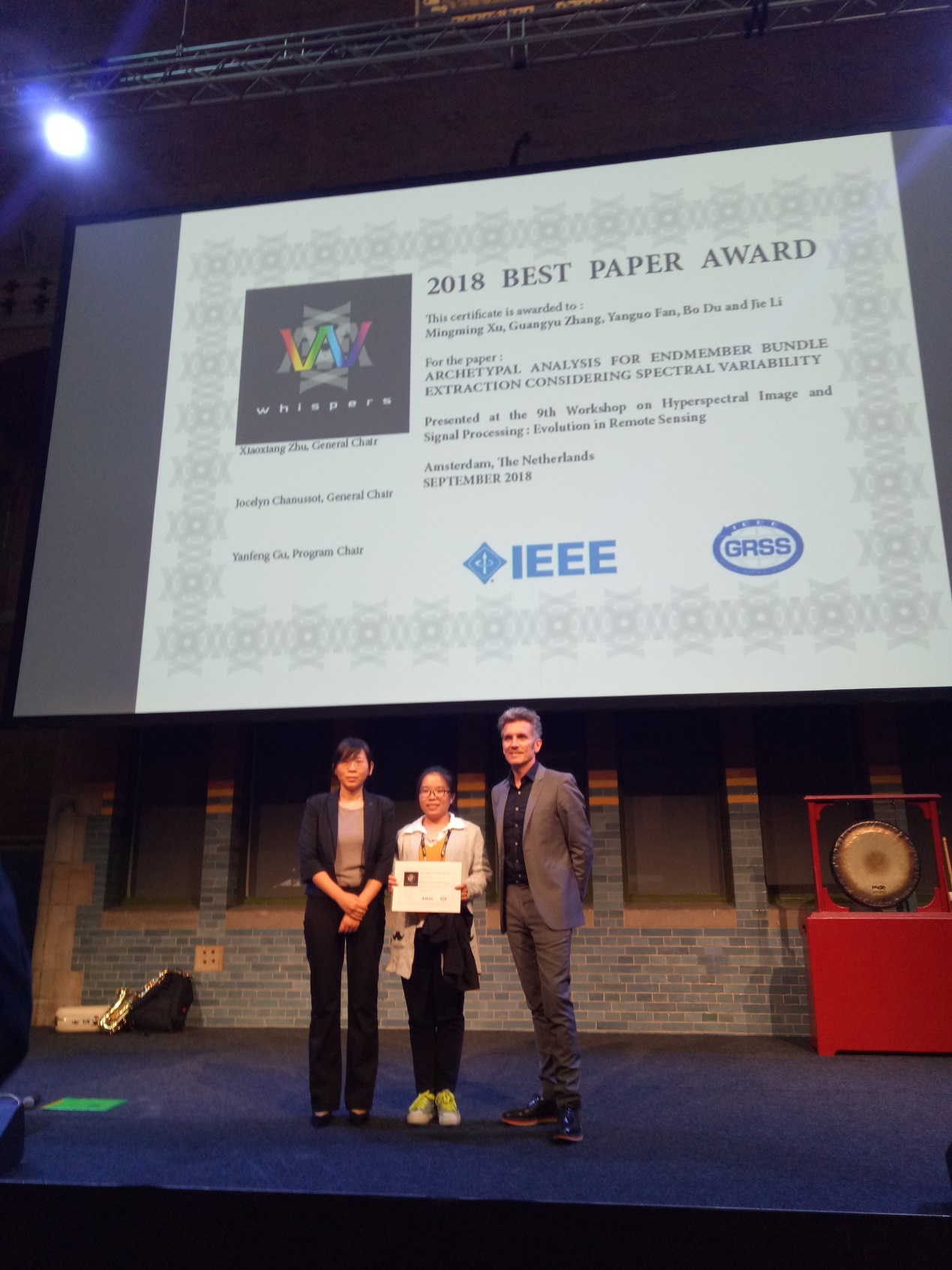 在本次会议上,地学院测绘系许明明博士做了题为:“Archetypal analysis for endmember bundle extraction considering spectral variability”的口头报告,第一次提出“支撑端元”的概念,为解决混合像元分解中光谱变化问题提供了新的思路,受到与会者的广泛关注与讨论,被大会评为最具突出贡献的论文,被授予“2018 Best Paper Award”。