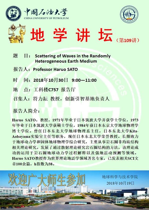 【地学讲坛第109讲】关于Professor Haruo SATO 教授的学术报告通知