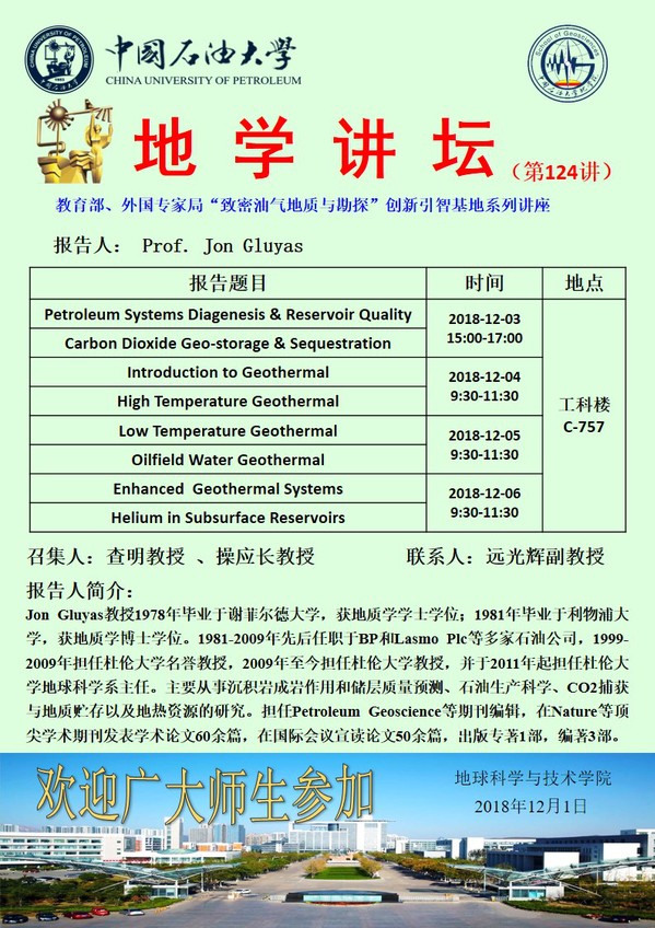 【地学讲坛第124讲】关于Prof. Jon Gluyas的学术报告通知