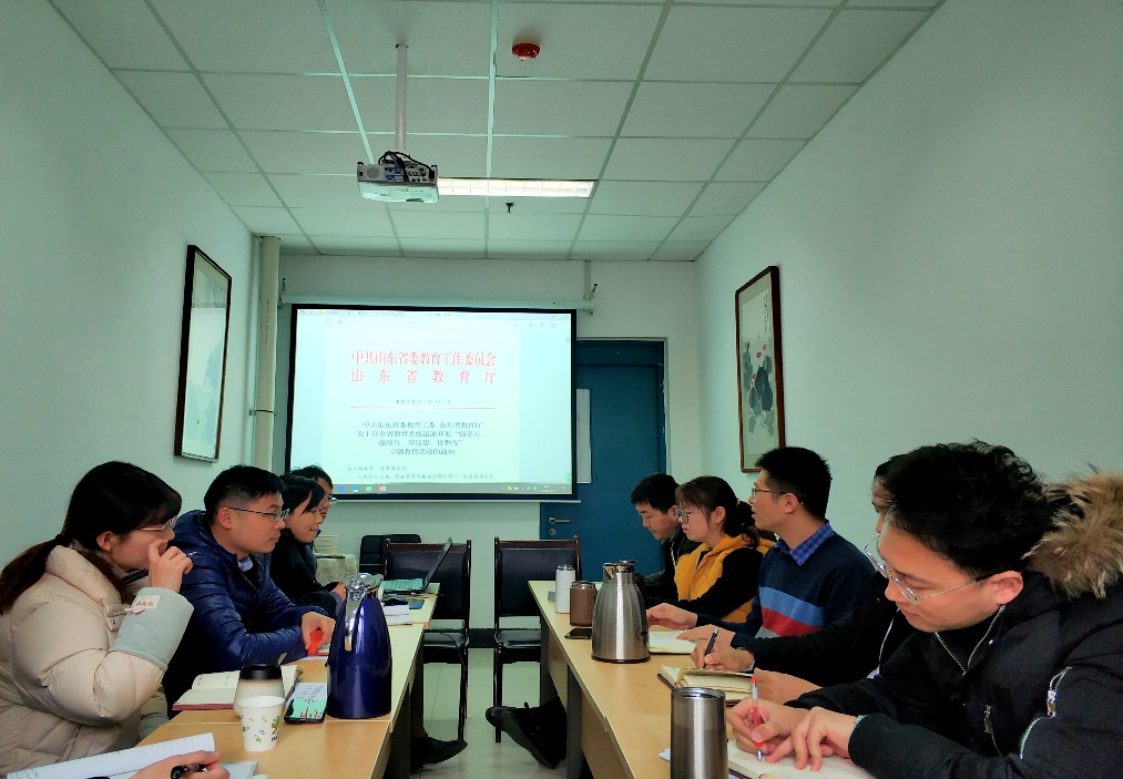周晓东老师带领全体参会人员研读《中共山东省委教育工委 山东省教育厅关于在全省教育系统迅速开展“强学习、提站位、深反思、促整改”专题教育活动的通知》,重点学习了党中央、国务院有关依法治校、依法从教、规范办学的决策部署,省委、省政府、教育部有关政策要求,省委教育工委、省教育厅有关文件规定等。徐永涛副书记以“红蓝导向”为切入点,提出“立德树人”是教育之本,一方面要在制度上层层把关,紧抓学术科研道德与安全教育;另一方面要深化学生的“红线”意识,关注学生心理动态,构建家校同心信息畅通机制。