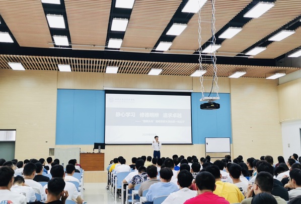 2020级辅导员徐明权欢迎各位新生来到学校和学院,并介绍2020级新生的整体情况,希望300名新同学在师生共同努力下涵养大格局、实现大发展。随后,徐明权以《静心学习,修德明辨,追求卓越——“勘探尖兵”如何系好大学的第一粒扣子》为题,希望新生在大学生活中养成一种习惯、形成一种品格、找准一个方向。“静心学习,就是要求你们在刚进入缤纷校园时,能够沉住气、静下心,稳住大学的基本盘”,徐明权对学分制、各类奖学金及保研考研等方面细致解读,督促新生在大学起步阶段,要稳住学习成绩,提高学习能力,认清学业“红线”,打造自己大学生涯的核心竞争力;在“修德明辨”方面,他希望新生在大学期间要养成正确的人生观、世界观、价值观,既要有优质的外在形象气质,更要有优质的内在品德修为,通过列举当前国内外热点事例和校园安全实例,要求新生学会正确认识学校教育、安全等方面的管理规定并严格遵守;“系好大学的第一粒扣子,就要定好学习和生活的标尺”,徐明权要求全体2020级新生要秉承“追求卓越”的石大精神,以独立、自律、保持激情时刻要求自己,才能成长为一名可堪大任的新时代“勘探尖兵”。最后,徐明权告诫新生时刻牢记并遵守“品行端,学风正,纪律严”的年级作风,脚踏实地,奋力成长。