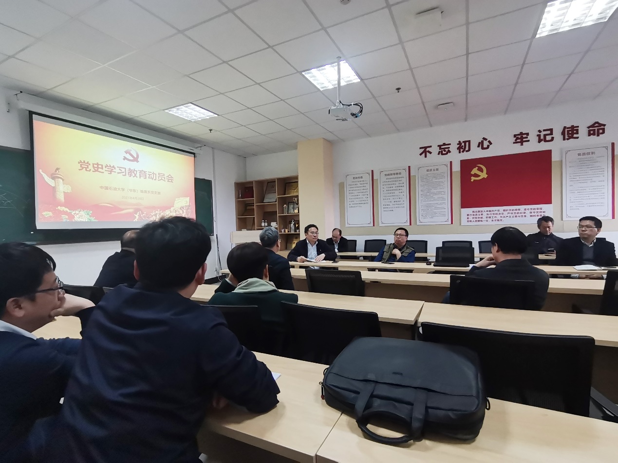 2021年4月28日,地质系党支部在系会议室召开党史学习教育动员会,副校长操应长参加会议,会议由支部书记陈勇教授主持。