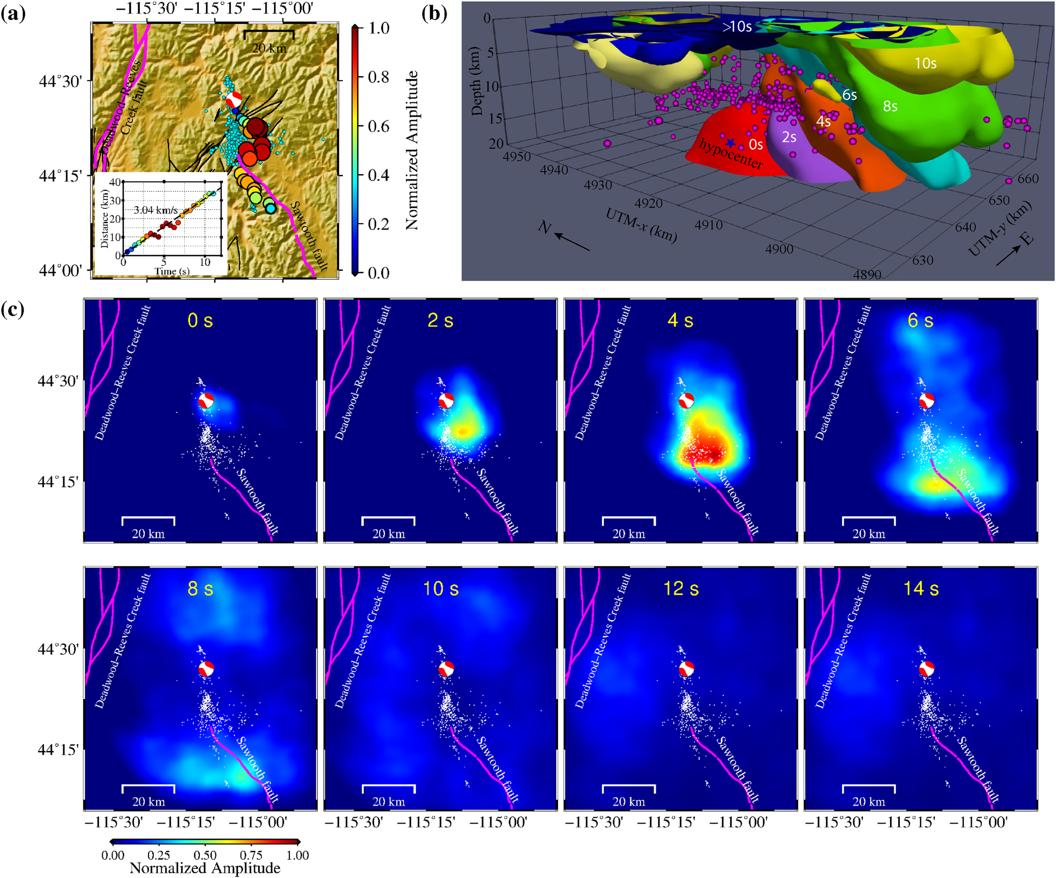 图1: 2020年6.5级爱德华地震多方位角反投影震源成像结果.(a)Z-型破裂路径,(b)三维震源破裂过程,(c)震源深度切片上不同时刻的震源破裂成像结果。