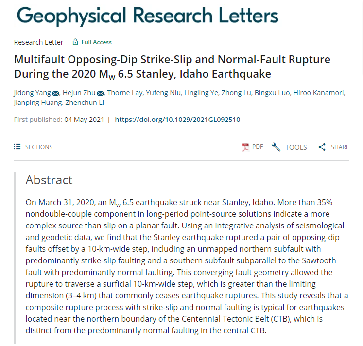 近日,我院地震波传播与成像团队与加州理工大学、加州大学圣克鲁兹分校、德州大学达拉斯分校、南卫理工大学、南方科技大学等高校合作,在爱德华地震破裂过程研究方面取得最新进展,相关研究成果《Multifault Opposing-Dip Strike-Slip and Normal-Fault Rupture During the 2020 Mw 6.5 Stanley, Idaho Earthquake》(2020年爱德华州6.5级地震走滑及正断层复杂破裂过程研究)发表在国际地球物理领域一区Top期刊《Geophysical Research Letters》上。论文第一作者为我院光华学者特任教授杨继东,太阳成tyc7111cc为第一署名单位。该成果得到国家自然基金创新研究群体、国家优秀青年基金、国家重点研发计划项目及太阳成tyc7111cc光华学者(特聘、拔尖)基金联合资助。
