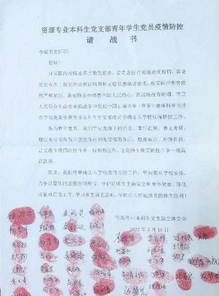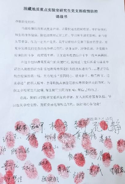 资源专业本科生党支部、储层地球物理实验室党支部、储层地球物理实验室博士生党支部、地物专业本科生党支部等支部纷纷签署《疫情防控请战书》,发出了“我是党员我带头”,“我是党员我先上”的最强音,为后续志愿服务工作开展打好了坚实的基础。