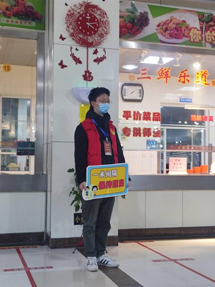 在餐厅取消堂食期间,学生党员积极服务就餐同学,参与就餐排队引导工作,使得学生就餐行为安全高效,进一步保障学生饮食安全。同时,为进一步加强疫情防线,学院对宿舍与科研区域进行定点定时消毒,学生党员发挥带头模范作用,带头对宿舍及办公室进行消杀,并及时将学院发放的口罩送到学生手中,确保了宿舍与办公室环境安全。