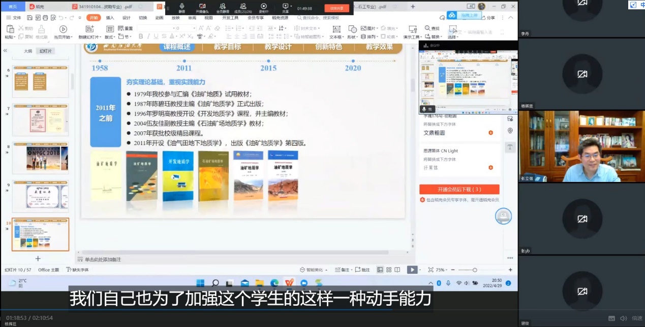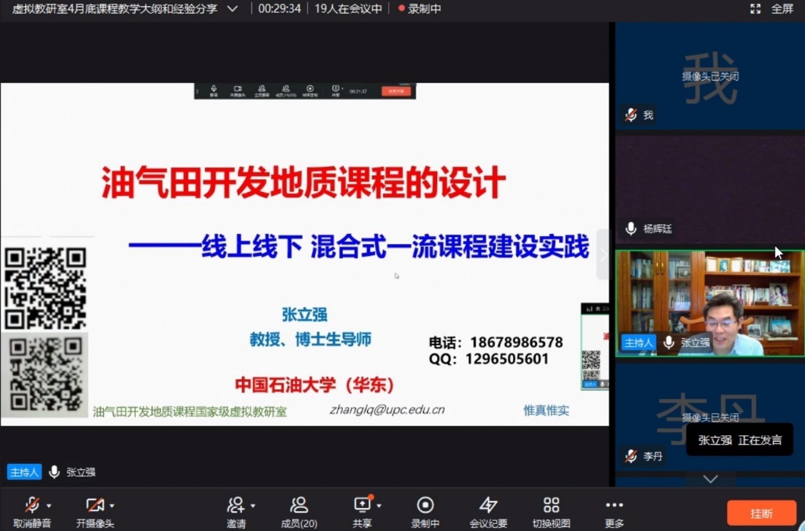 为响应教育部落实立德树人根本任务,加快教育高质量发展的号召,落实教育部加快推进虚拟教研室试点建设的工作要求,油田开发地质课程教育部首批虚拟教研室建设点从今年3月开始开展了系列研讨活动,规划了教研室2022年工作重点、规范了教学活动时间和相关制度。按照计划,4月29日,该教研室开展了教学大纲、教学经验分享研讨活动。来自太阳成tyc7111cc、山东科技大学、西北大学、西南石油大学、东北石油大学、西安石油大学、中国地质大学(武汉)、中国石油大学(北京)等12所高校的教研室骨干30余人参加了本次研讨活动。