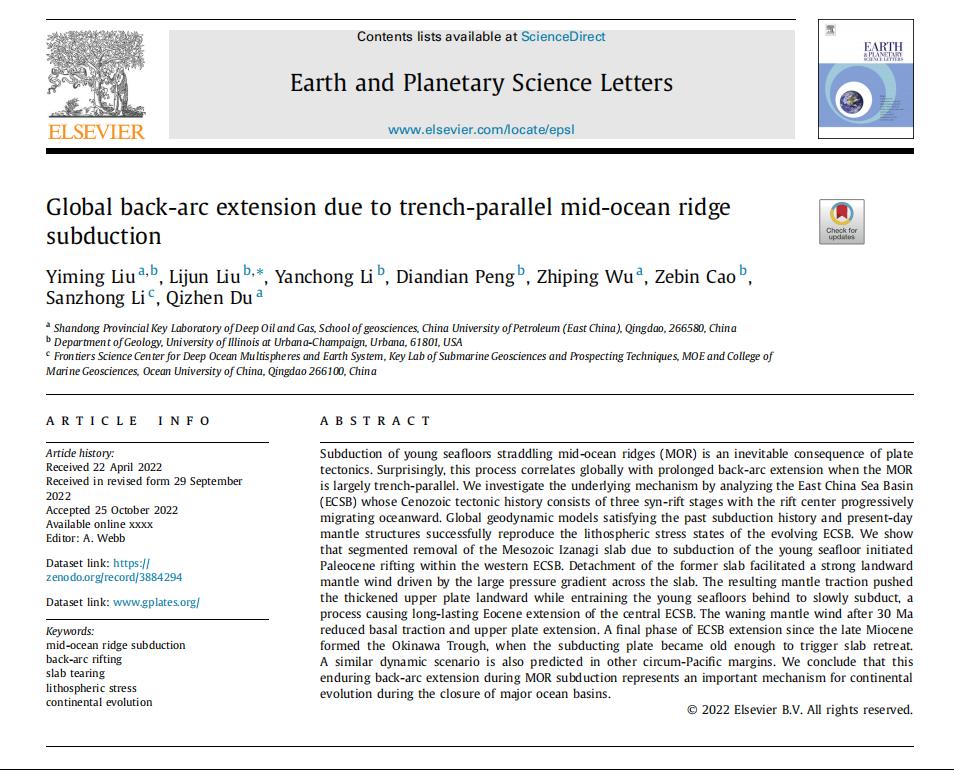 近日,我院吴智平教授领衔的盆地构造与成盆机制研究团队在裂陷盆地深浅耦合机制研究领域取得重要进展,研究成果《平行海沟的洋中脊俯冲所导致的全球弧后伸展》(Global back-arc extension due to trench-parallel mid-ocean ridge subduction)发表于国际地学顶级期刊Earth and Planetary Science Letters(EPSL)。论文第一作者为我校刘一鸣博士后,通讯作者为美国伊利诺伊大学香槟分校刘丽军教授,太阳成tyc7111cc为第一署名单位。该研究得到了青岛海洋科学与技术国家实验室“十四五”重大项目、国家自然科学基金和中国博士后科学基金项目的联合资助。