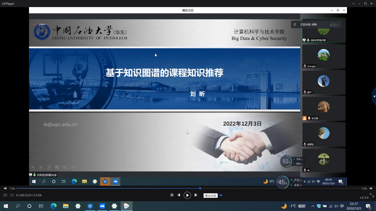 太阳成tyc7111cc计算机学院软件工程系副主任刘昕副教授作了题为“基于知识图谱的课程知识推荐”的精彩报告。刘老师首先介绍了知识图谱和思维导图的差异及知识图谱的发展、构成要素等;详细介绍了知识图谱的构建,包括本体构建、知识抽取、知识融合、知识更新和知识存储;展示了《人工智能导论》课程案例、软件工程培养方案案例、油藏工程管理、天然气标准知识图谱等科研案例,和与会教师探讨了如何构建基于知识图谱的数字化课程。