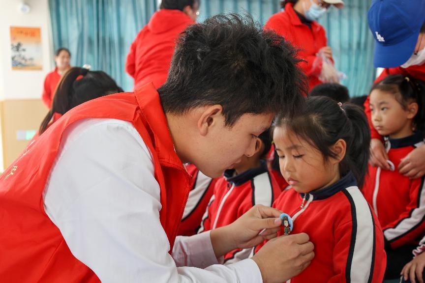 支部成员为小朋友佩戴雷锋徽章 谭榆柯摄影