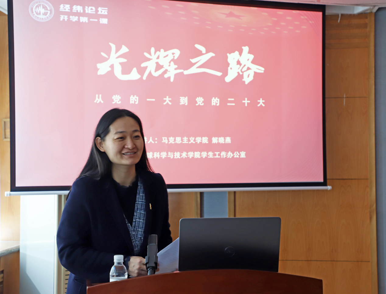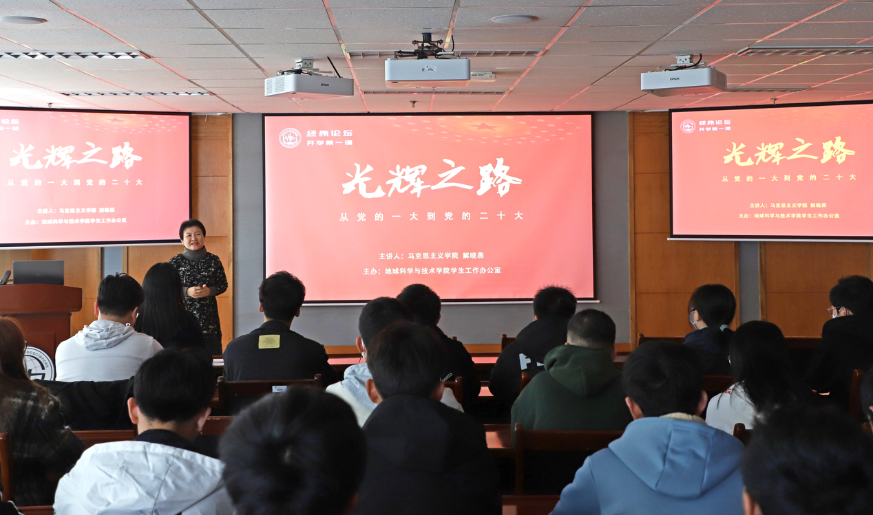 “什么是政党?”“中国共产党是怎样在布满靳棘的环境中走出一条光辉之路的?”“如何理解中国式现代化?”3月30日上午,学院邀请学校马克思主义学院副教授解晓燕做客“经纬论坛”,作题为《光辉之路——从党的一大到党的二十大》的精彩报告,学院党委副书记郑珊珊主持,130余名学生党支部委员及青年学生参加论坛。