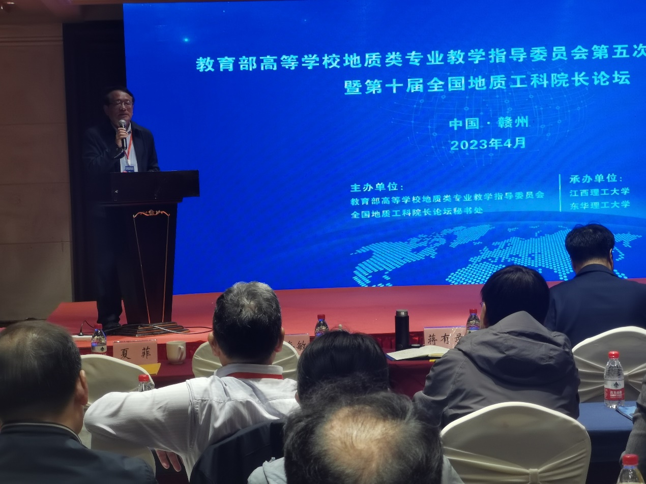 江西理工大学校长温和瑞在开幕式上致辞。我校教育部高等学校地质类专业教学指导委员会副主任委员蒋有录教授主持了一流专业和一流课程的大会报告,并作了大会发言。