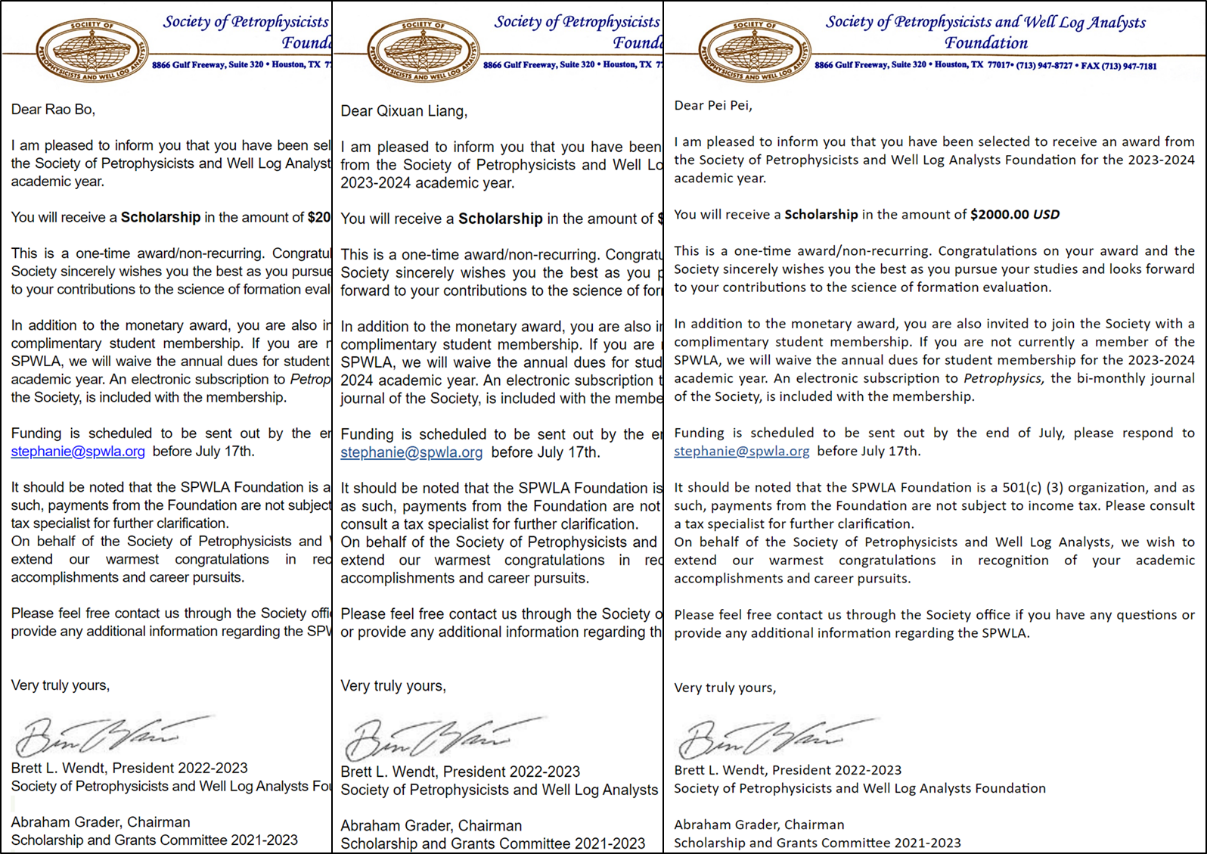 近日,经过国际岩石物理学家和测井分析家学会(Society of Petrophysicists and Well Log Analysts,SPWLA)评定,我院测井系博士研究生饶博、梁启轩和硕士研究生裴培3人获得2023年度SPWLA学生奖学金,奖金为每人2000美元。指导教师分别为苏远大教授、张锋教授和邓少贵教授。