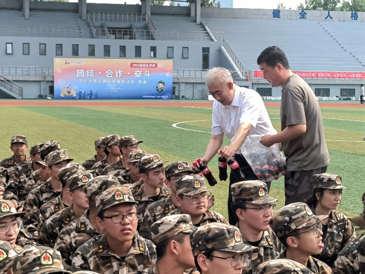 随后,赵放辉和到场老师对同学们的身体健康进行了关心和询问,为同学们分发了饮料,并叮嘱同学们注意防晒,注意休息,遇到困难及时和教官和辅导员老师沟通。