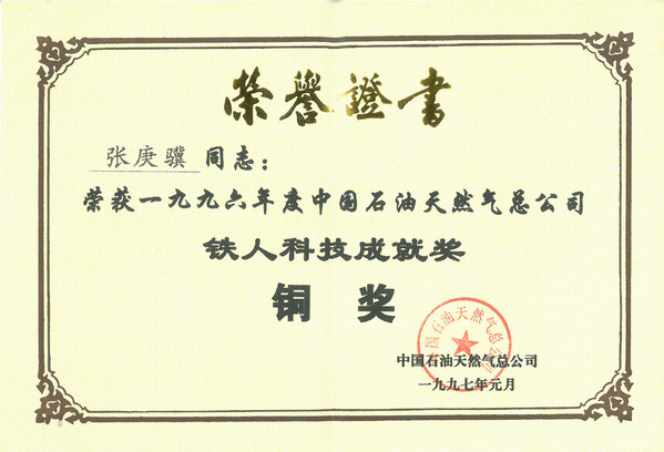 1997年1月,我院张庚骥教授获得1996年度中国石油天然气集团公司“铁人科技成就奖”铜奖。