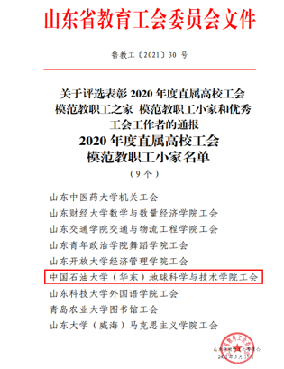 2021年6月,山东省教育工会委员会发文《关于评选表彰 2020 年度直属高校工会模范教职工之家 模范教职工小家和优秀工会工作者的通报》(鲁教工〔2021〕30 号),我院工会获模范教职工小家称号,全省共9个。