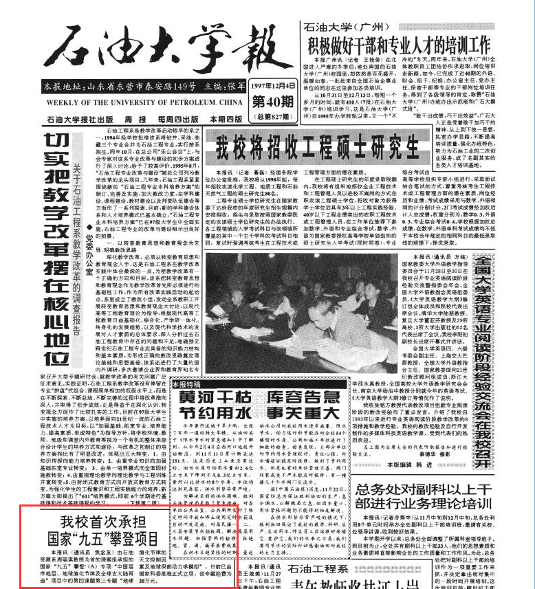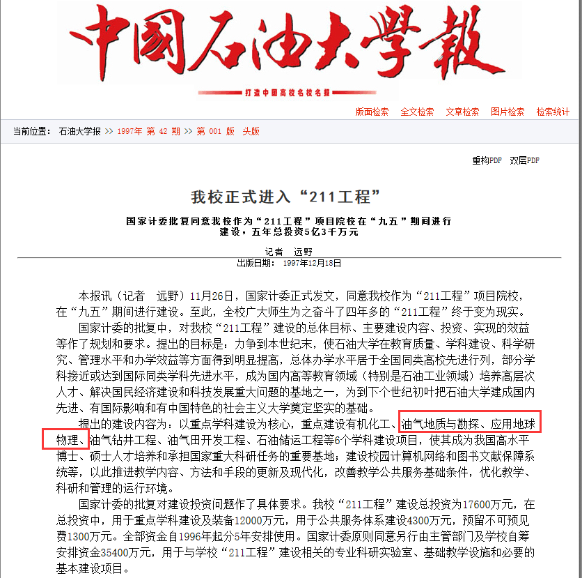 1997年11月26日,国家计委正式发文,同意石油大学作为“211工程”项目院校在“九五”期间进行建设。我院油气地质与勘探、应用地球物理学科入选重点建设学科。