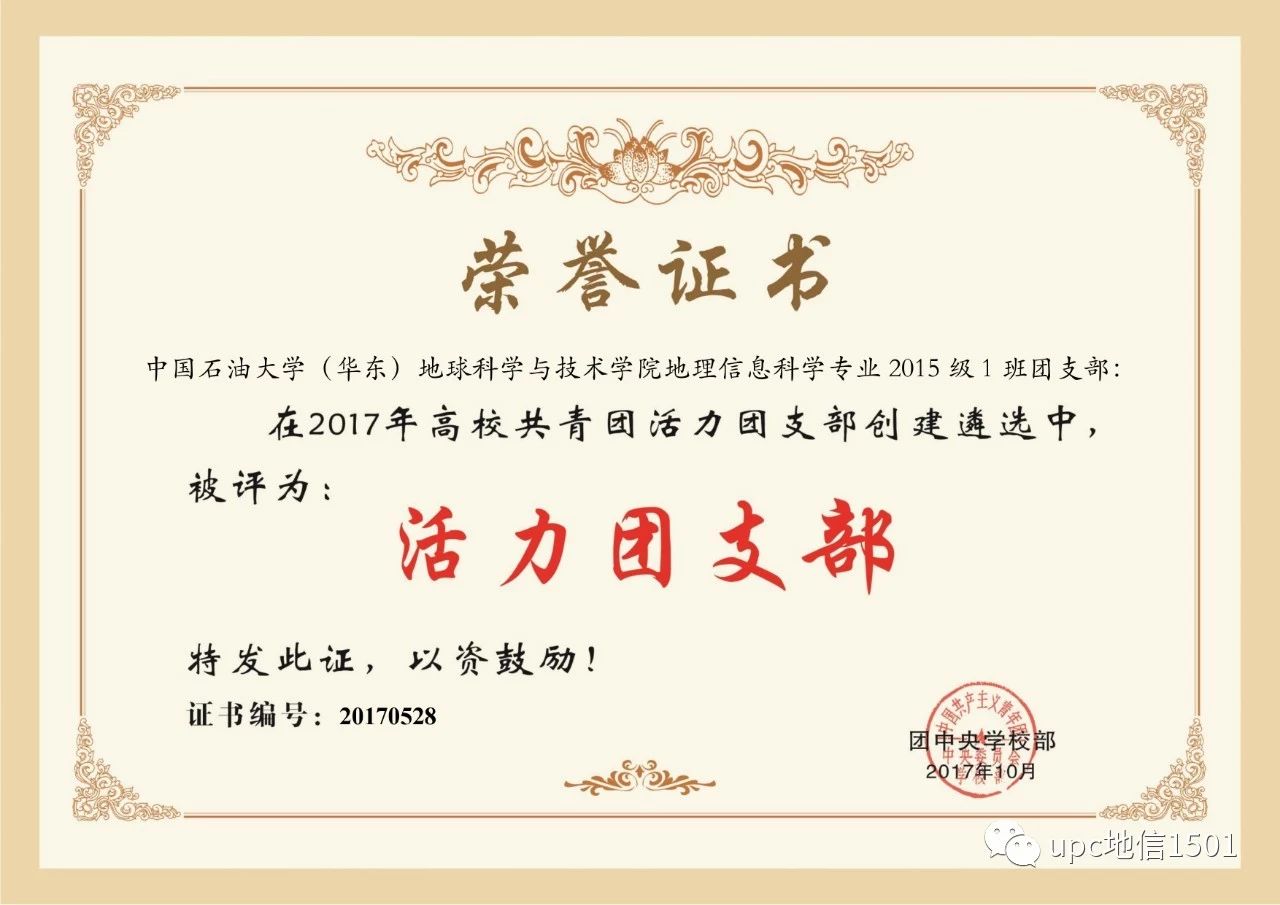 2018年3月,团中央学校部公布2017年全国高校“活力团支部”遴选结果,地理信息科学2015级1班团支部入选。