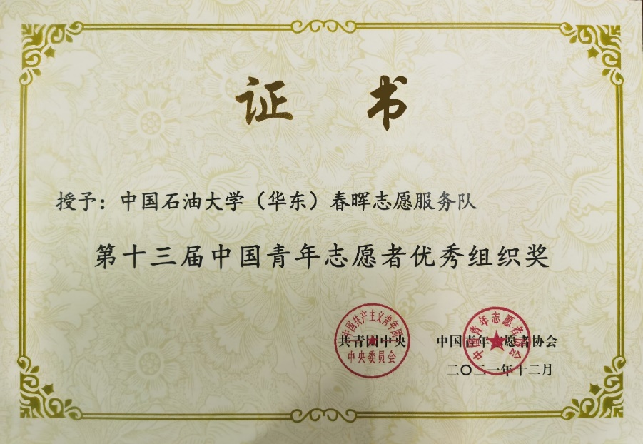 2021年12月,我院春晖志愿服务队等100个组织荣获第十三届“中国青年志愿者优秀组织奖”。