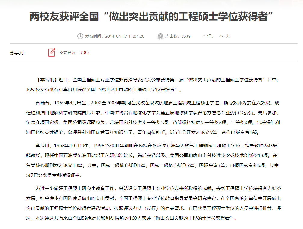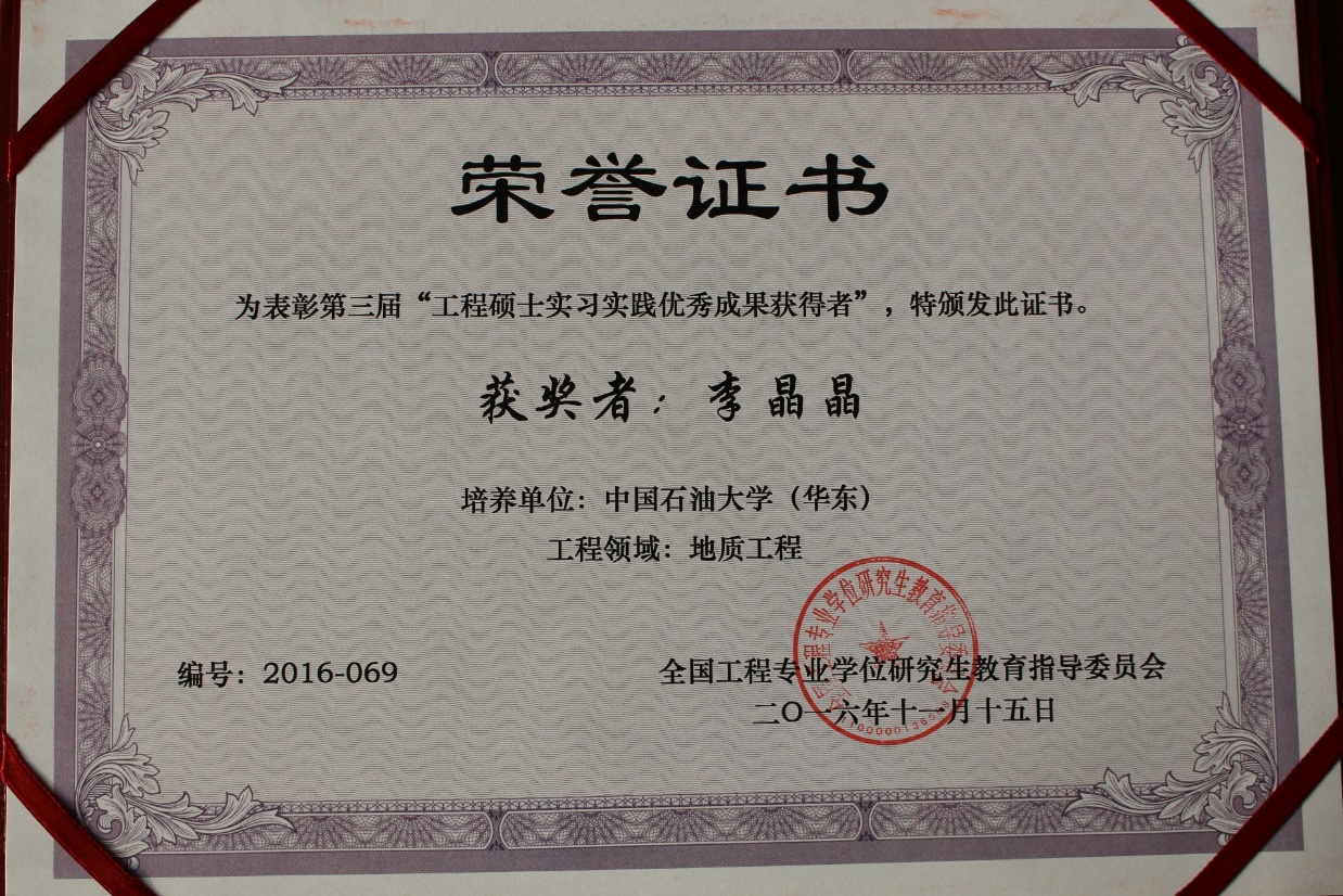 2016年11月,全国工程专业学位研究生教育指导委员会发布《关于公布第三届“工程硕士实习实践优秀成果获得者”荣誉称号名单的通知》,我院2015届全日制工程硕士毕业生李晶晶获得该荣誉称号。