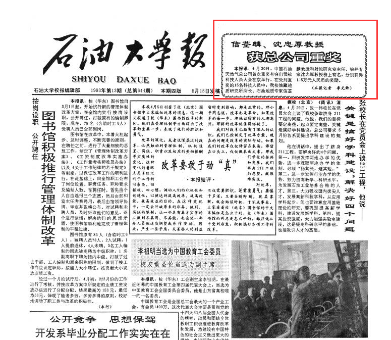 1993年4月,中国石油天然气总公司首次重奖有突出贡献科技人员大会在京举行,我院油藏地质研究所所长、石油地质专家信荃麟教授榜上有名,获得1.5万元人民币的奖励。