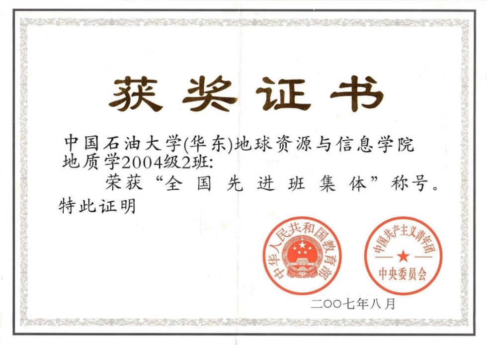 2007年8月,我院地质学2004级2班被教育部、团中央授予“全国先进班集体”称号。
