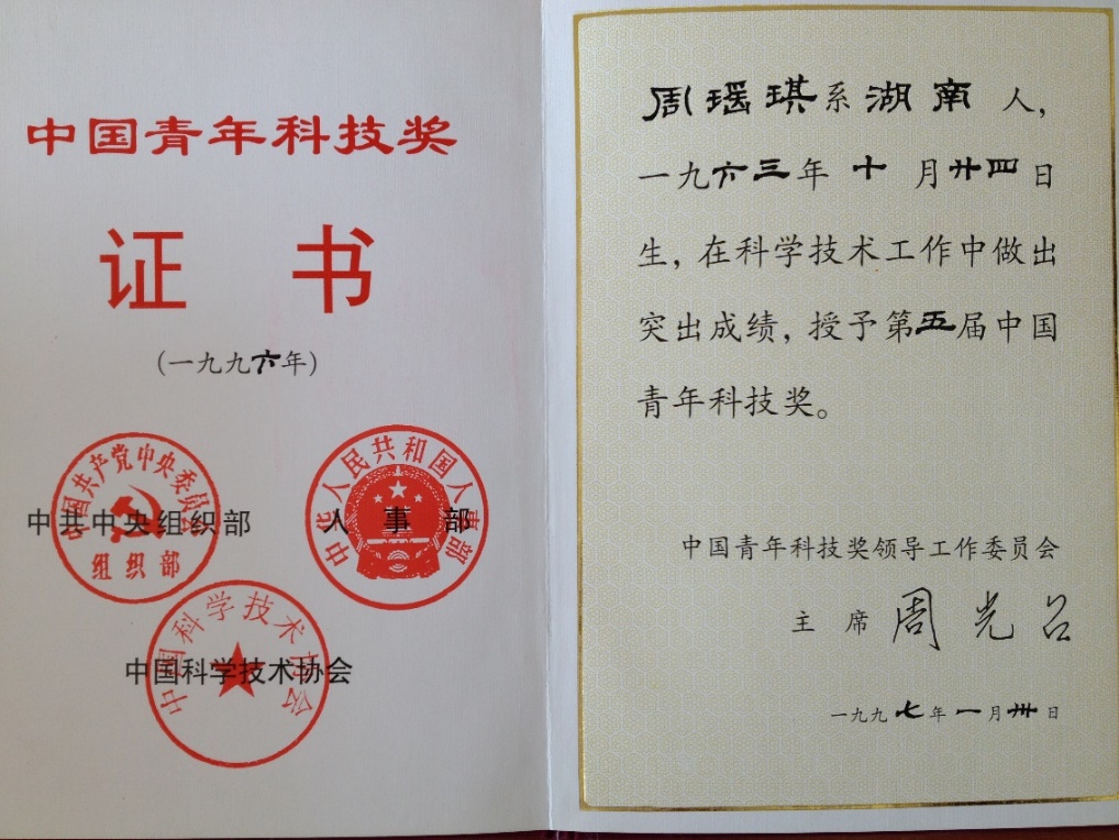 1997年3月22日,第五届中国青年科技奖颁奖大会召开,我校资源系教授、博士生导师周瑶琪因其在事件地质学、化学层序地层学、太阳原始星云原子团簇等方面的独创性工作荣获此奖。