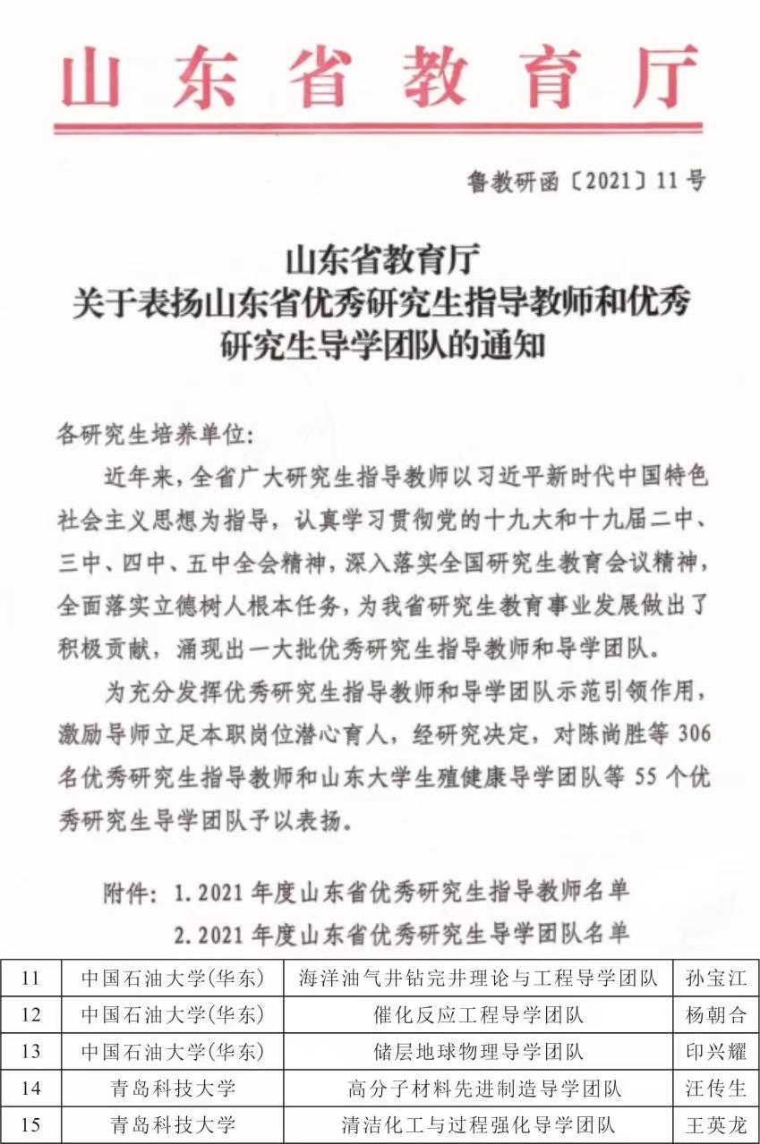 2021年9月,山东省教育厅发文公布山东省优秀研究生导学团队名单,我院印兴耀教授负责的储层地球物理导学团队名列其中。