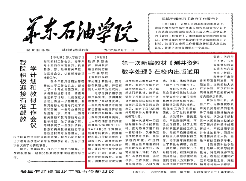 1975年5月,勘探系教师雍世和、黄一飞、洪有密与胜利油田测井公司、计算中心合作完成我国第一张测井数字处理成果图。