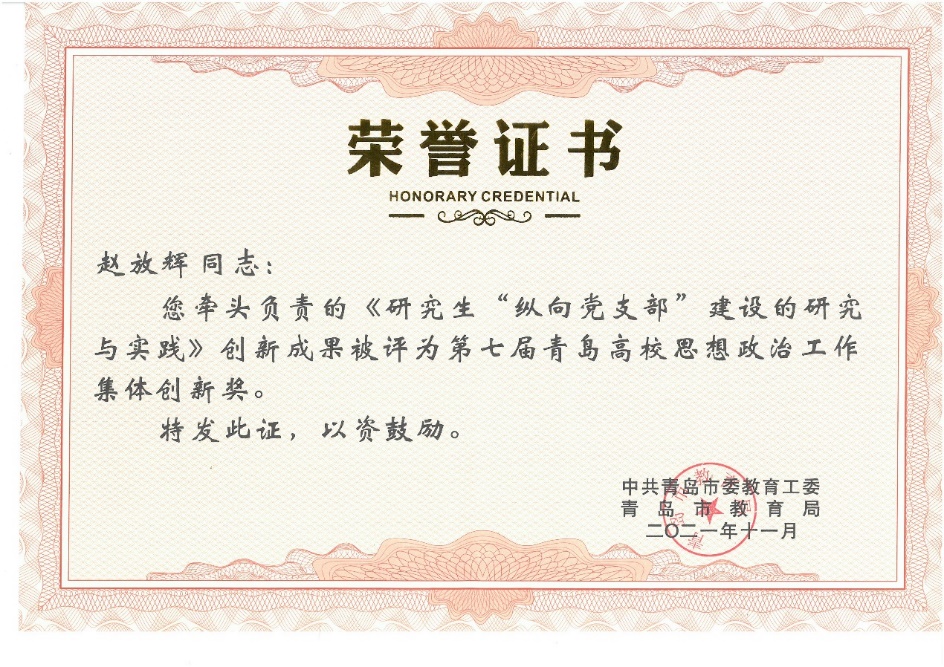 2021年11月,青岛市委教育工委公布第七届青岛高校思想政治工作创新奖获奖名单,我院申报的项目《研究生“纵向党支部”建设的研究与实践》获青岛高校思想政治工作集体创新奖,是我校唯一获集体创新奖的项目。