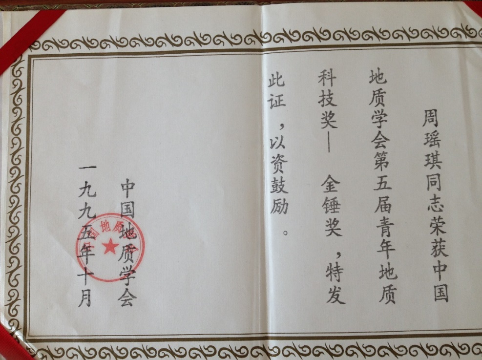 1995年11月,我院年轻博士后周瑶琪教授荣获中国地质学会青年地质科技奖——“金锤奖”。