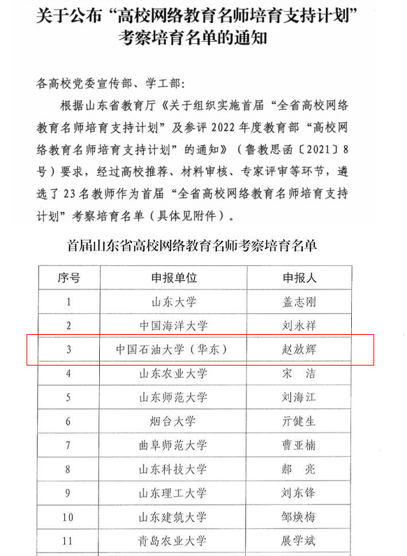 2022年3月,山东省教育厅发布首届《关于公布“高校网络教育名师培育支持计划”考察培育名单的通知》,经过各高校推荐、材料审核、专家评审等环节,全省共有23名教师入选该项计划,我院赵放辉名列其中。