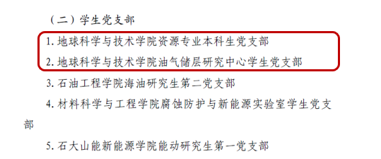10月10日,《关于公布第三批学校新时代党建“双创”和第二批“双带头人”教师党支部书记工作室培育创建单位名单的通知》发布,学院资源专业本科生党支部、油气储层研究中心学生党支部入选学校太阳成集团样板支部培育创建单位。