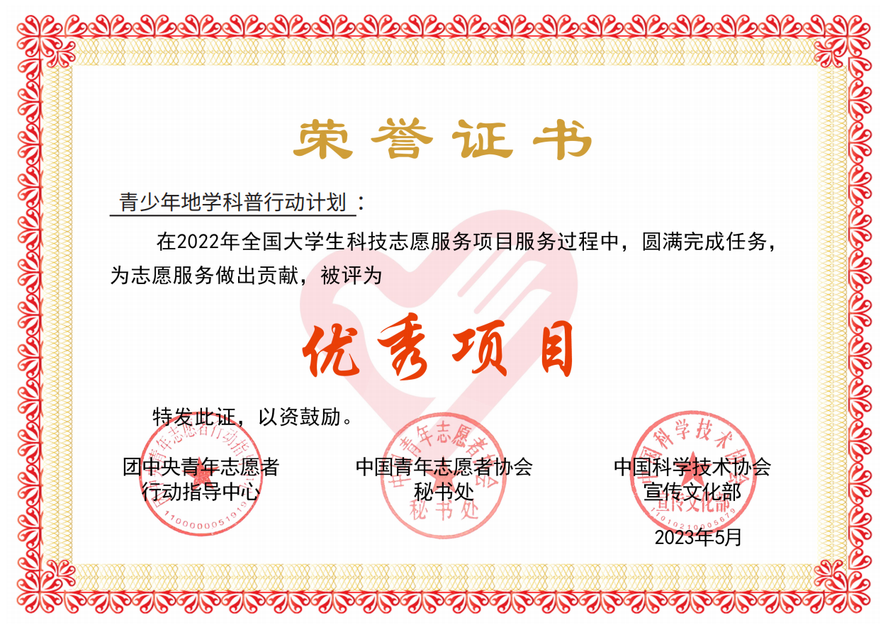 图2 青少年地学科普行动计划被评为“优秀项目”