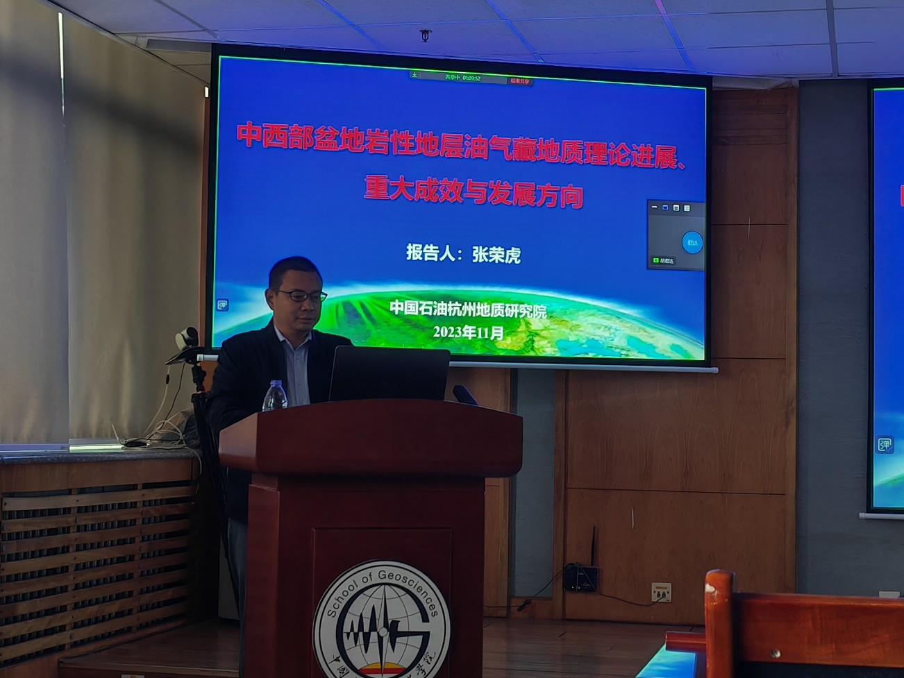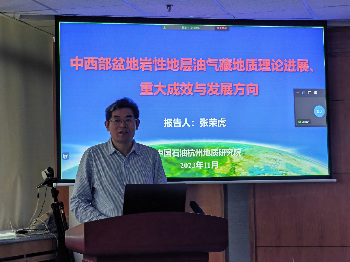 2023年11月5日上午,地学院教育部“油气田开发地质课程虚拟教研室”举办线上线下教学公开课—行业前沿专题讲座,邀请了中国石油勘探开发研究院杭州地质研究院企业高级专家张荣虎教授级高级工程师,作题为《中西部盆地岩性地层油气藏地质理论进展、重大成效与发展方向》的专题报告,tyc7111cc太阳成集团地质资源与地质工程研究生、部分资源系教师,以及来自山东科技大学、吉林大学、中国地质大学(武汉)和贵州大学等全国十余所高校科研院所80余人参加了线上、线下会议,教育部虚拟教研室负责人、资源系主任张立强教授主持会议。
