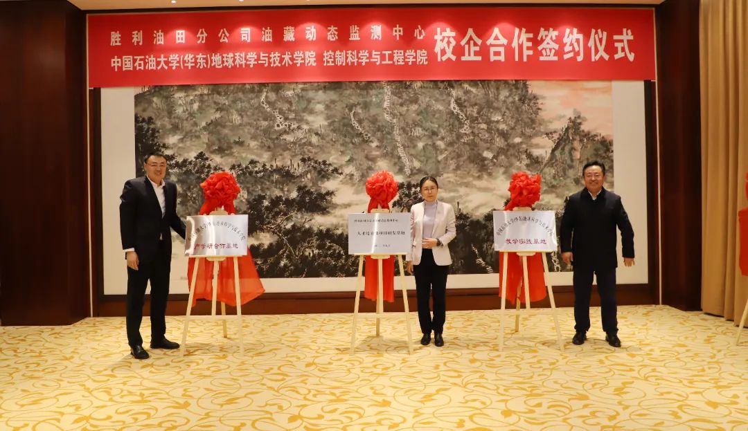 在签约仪式上,校企双方签署了全面合作协议并举行共建基地揭牌仪式,约定双方共建教学实践基地、产学研合作基地、人才培养及项目研发基地,明确了在人才培养、科技创新、技术研发等方面的合作机制和内容,为双方的合作提供了明确的指导和保障。双方现场还签署了合作项目意向书、党建联建协议,颁发校外指导教师和企业顾问聘书,标志着胜利油田分公司油藏动态监测中心与我院全面合作正式启动。