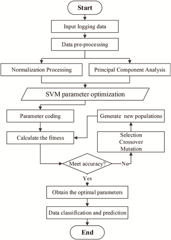 油气资源评价中,干酪根类型等烃源岩特性至关重要。然而,由于地层各向异性显著以及地球物理测井数据与实验室地球化学观测值之间的相关性差,确定干酪根类型具有极大挑战性。本文综合地质条件、测井数据和地球化学数据,提出了一种利用遗传算法驱动的支持向量机(GA-SVM)进行干酪根类型识别算法。该方法的主要包括两部分,首先使用支持向量机对小样本数据进行分类,测井数据(中子、声波、密度、伽马射线、电阻率、铀含量、钾含量和钍含量)以及地球化学交会图确定的干酪根类型作为训练数据集。其次,利用遗传算法优化模型参数,在交叉验证下确定最优惩罚参数和核函数,实现干酪根类型和空间分布的定量表征,并评估预测结果的准确性。测试结果表明,与网格搜索算法和传统的交会图确定湖相页岩干酪根类型方法相比,GA-SVM更精确、更高效。