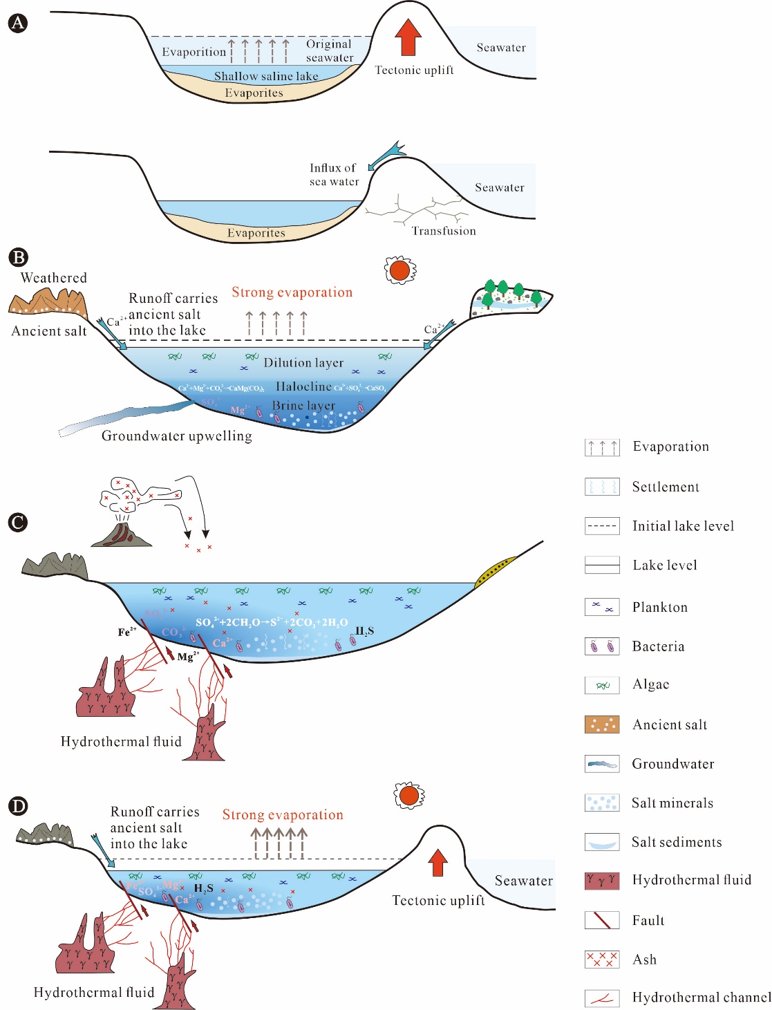 研究选取现代及古代的咸化湖盆为研究对象,探讨了不同地质时代咸化湖泊分布规律及控制因素、湖盆咸化机理、咸化湖泊水文特点及有机质富集规律。研究成果提出了湖盆咸化模式:(1)海水遗留型:主要由海水提供盐类物质;(2)内陆蒸发型:陆源提供盐类物质并伴有强烈的蒸发作用;(3)深部热液型:深部高盐度热液通过断裂输入盆地;(4)混合型:是前面三种成因方式的叠加(图1)。咸化湖盆的演化过程中,一种或几种作为主控咸化机理,并随着不同咸化时期而演变。结合现代典型咸水湖,探讨了湖泊水文生态(盐度、物理化学分层等)的控制因素,阐明了其对生物群落、地球化学过程、有机碳埋藏的控制机制。咸水湖泊中的生物种类随盐度的增加而减少,但生物总量并不减少,且在不同的分层水体中生物类型和生物地球化学过程存在显著差异。由盐度、水深和盆地规模等综合约束的氧跃层的深度控制了有机质氧化过程。