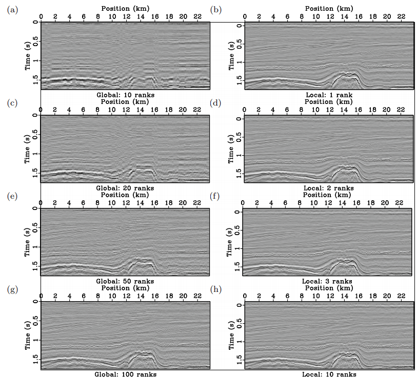 a、c、e、g是使用秩数分别为10、20、50和100的全局SVD的结果。b、d、f、h是使用秩号分别为1、2、3和10的局部SVD的结果