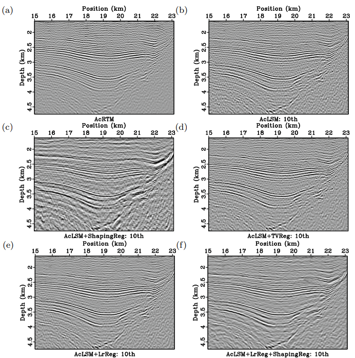 a.逆时偏移,b.最小二乘逆时偏移,c.整形正则化的最小二乘偏移,d.全变分正则化最小二乘偏移,e.低秩正则化最小二乘偏移,f.整形+低秩正则化最小二乘偏移