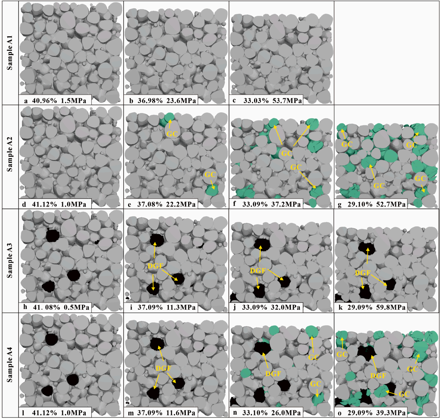 图1. 颗粒破碎、塑性变形以及堆积结构对深层砂岩储层压实减孔过程的差异影响