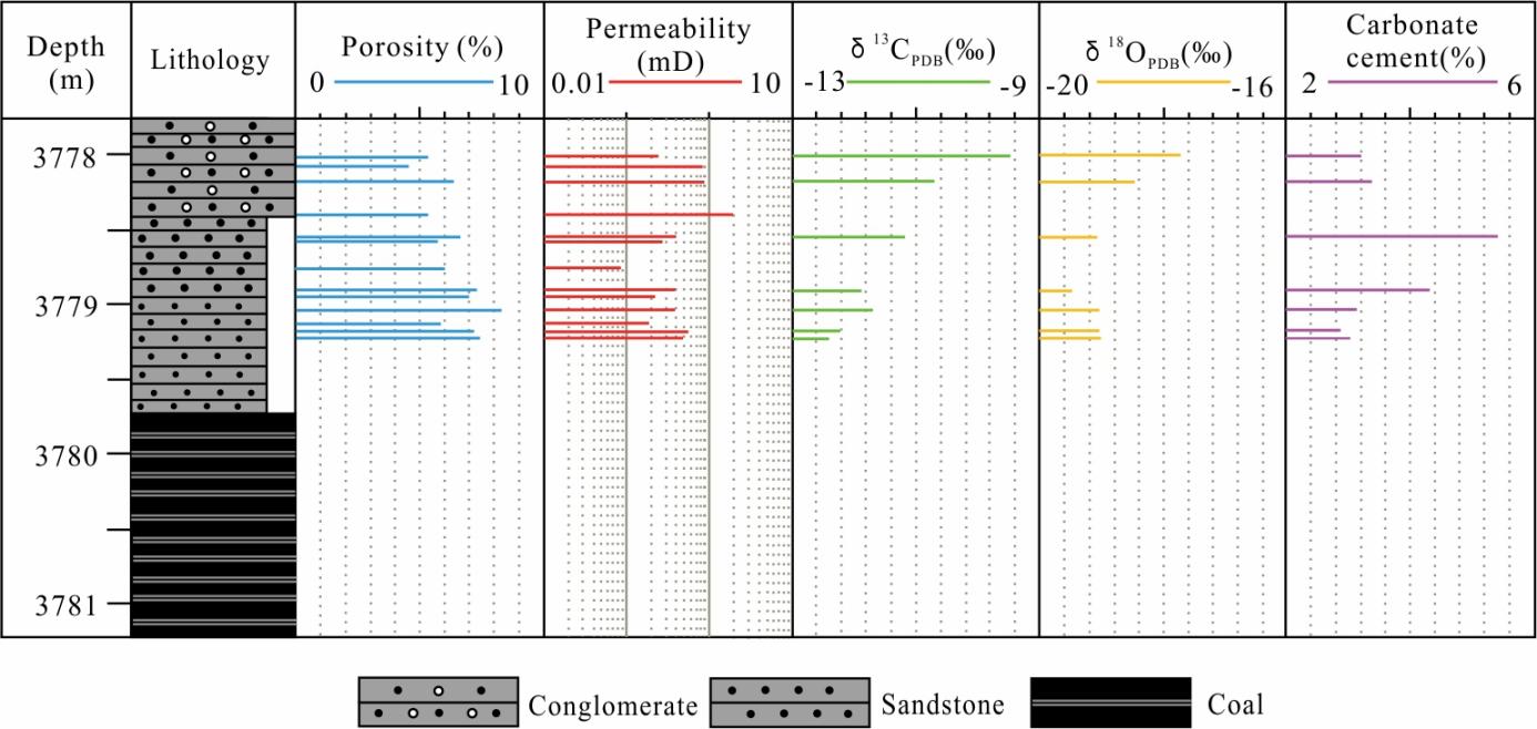 图1. Js1井煤层顶致密砂岩储层的孔隙度、渗透率、碳氧同位素以及碳酸盐胶结物含量随深度的变化