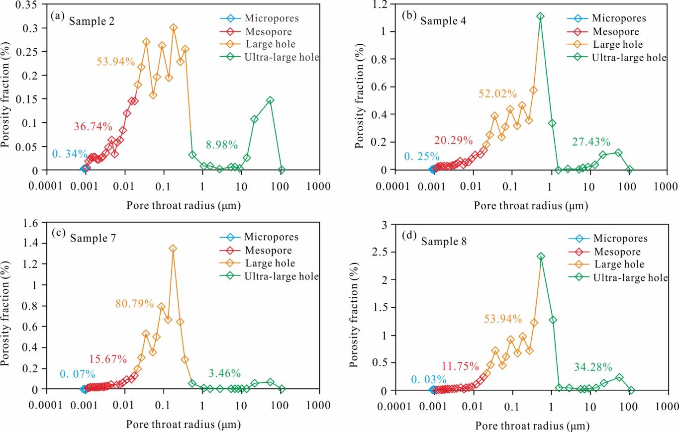 图2. 研究区煤层顶致密砂岩储层样品的孔喉分布特征