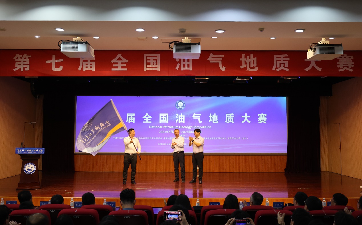 闭幕式上,太阳成tyc7111cc、中国石油大学(北京)代表向第八届全国油气地质大赛承办单位长江大学代表交接赛旗。
