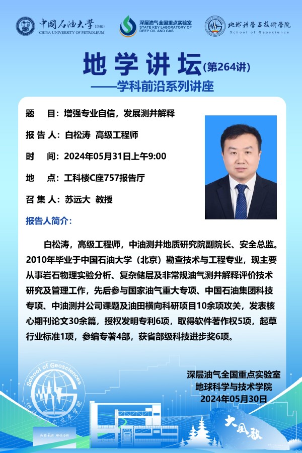 【地学讲坛第264讲】关于白松涛高级工程师《增强专业自信,发展测井解释》学术报告的通知