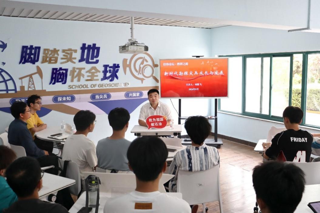 最后,林腾飞结合自身经历对各位同学提出了期望。他表示,各位同学充满青春的激情与活力,要勇于打破当下安逸,敢于挑战自我,尝试追求更高层次的成长道路。作为青年学生,要时刻牢记年轻就是自己最大的资本,不畏犯错,多与学长学姐交流请教,在不断尝试中成长。此外,在大学生活中要培养兴趣爱好,既能在生活中给自己减压,也能丰富大学生活。他希望同学们都能够始终保持自己的初心,不急功近利,脚踏实地的走好自己成长路上的每一步,继续在勘探报国路上砥砺前行。