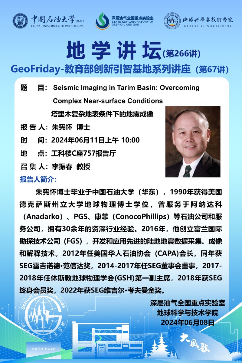 【地学讲坛第266讲】关于朱宪怀博士《Seismic Imaging in Tarim Basin: Overcoming Complex Near-surface Conditions》学术报告的通知